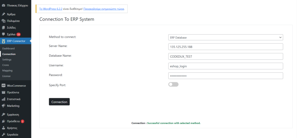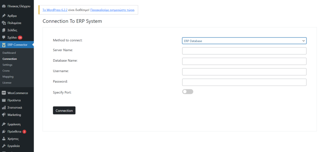 Step 1: Go to wordpress Dashboard and navigate to ERP-Connector -> Connection and Select ERP DATABASE method to connect.