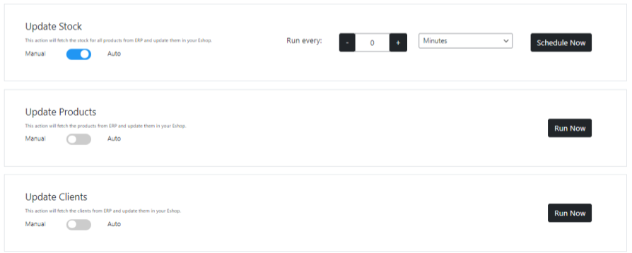 By switching the switcher to Auto, you have the option to change the crons recurrence. You can choose the unit of time you desire from the select dropdown and using the add or minus button, set the desired frequency. This operation takes place instantly and the new recurrence will appear in the info table immediately.